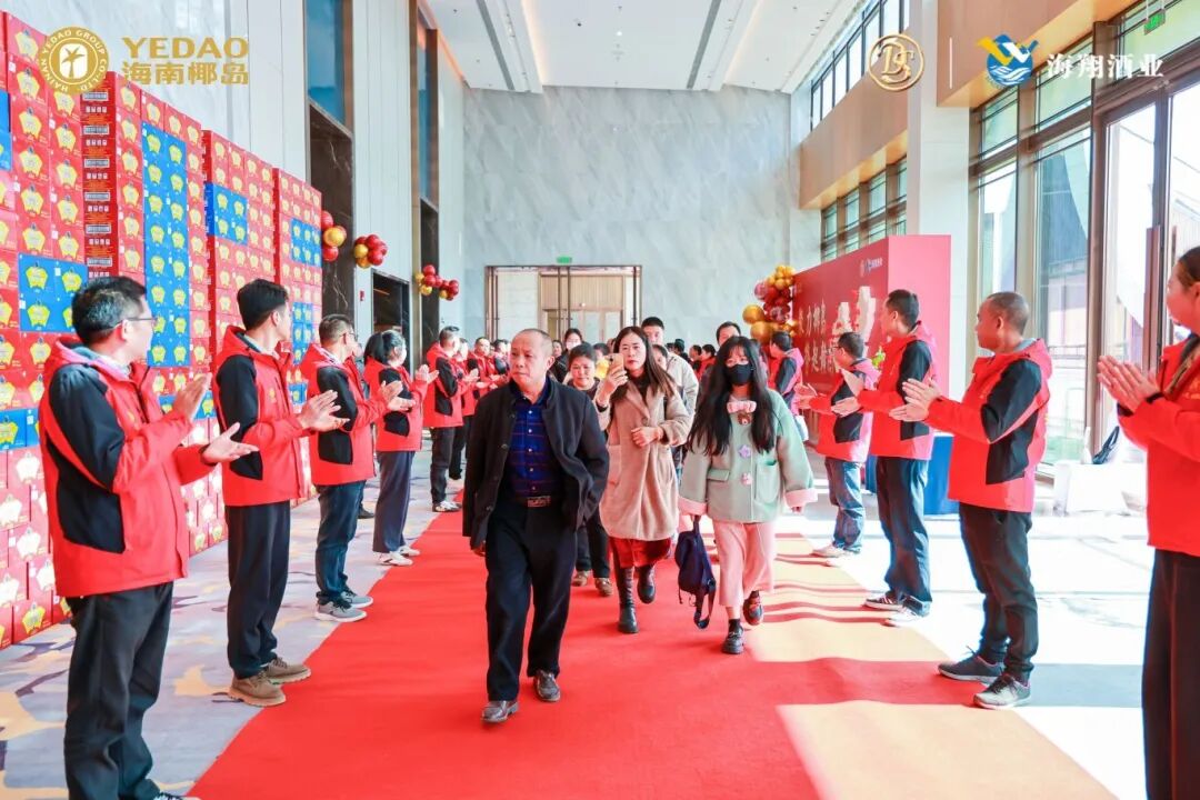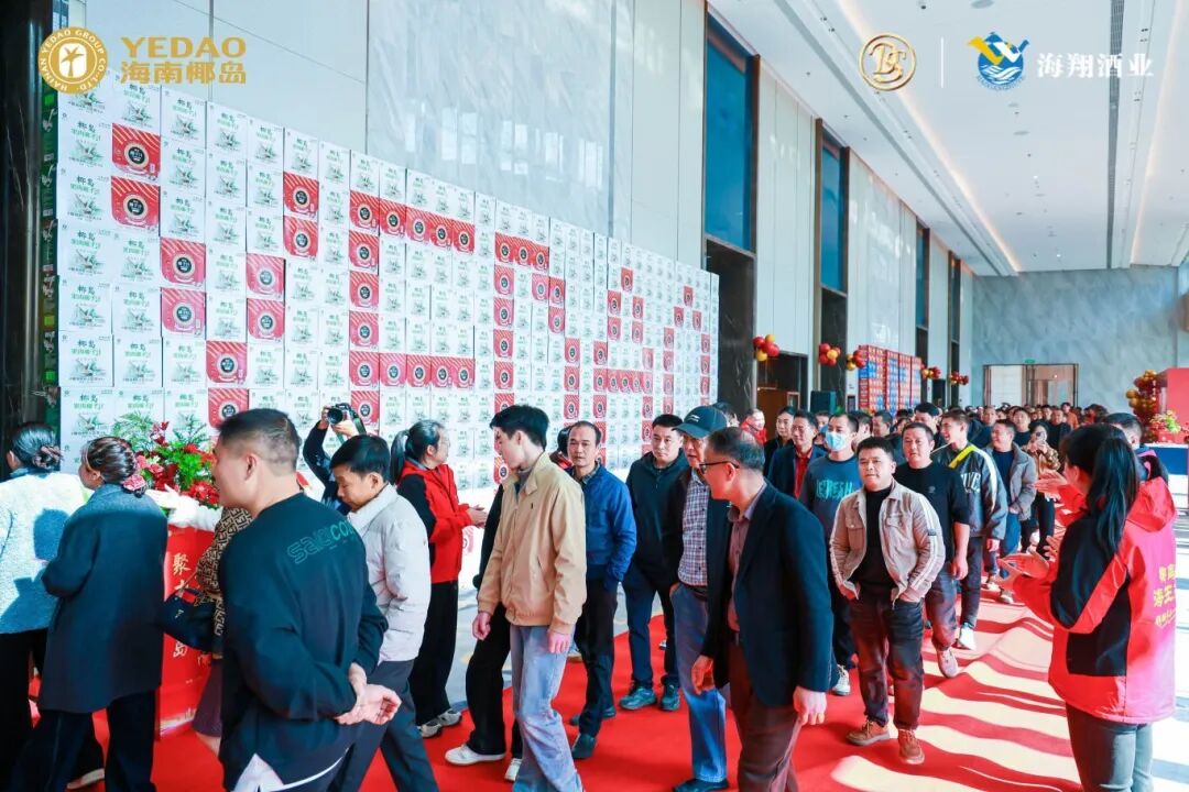 而最引人注目的,莫过于会场入口旁两座独具匠心的标识墙。墙体以无数盒椰岛椰汁与椰岛海王酒精心堆砌,巧妙地构筑出巨大的“YEDAO”标识与醒目的“2026”字样,有如两座象征着坚实基业与未来目标的丰碑,引得伙伴嘉宾们驻足称奇。