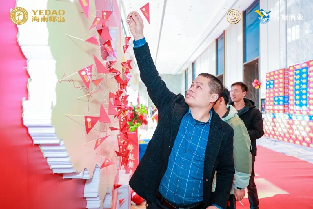 在热烈的氛围中,一场别开生面的“战略点亮仪式”将开场氛围推向首个高潮。每位嘉宾手持一枚印有“海南椰岛”的精致小旗,依次走向序厅一侧巨幅的全国市场战略版图,将旗帜庄重地插在江西、湖南、河南乃至更广阔的目标省份之上。